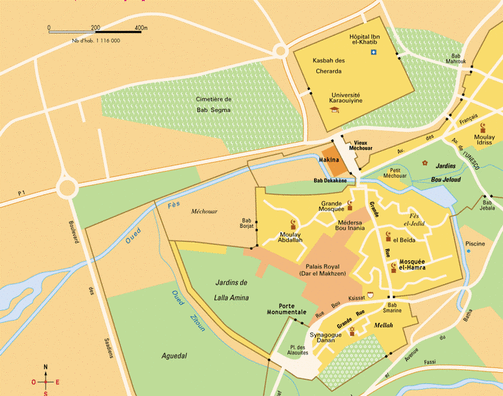 Notre carte montre, de part et d'autre de la vieille ville et de son enceinte percée de portes monumentales, le Jardin de l'Agdal et celui de Boujloud. Deuxième photo : le quartier très typique de Fès-al-Bali, qu'on voit par exemple restitués par Hergé (voir Tintin au Maroc dans "Le crabe aux pinces d'or" bientôt au cinéma).