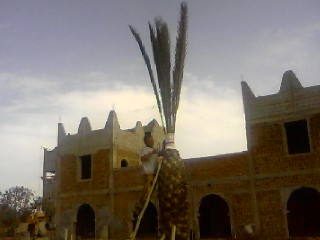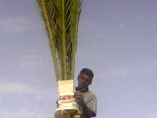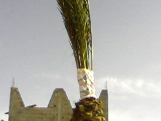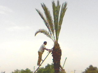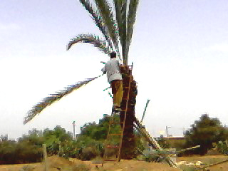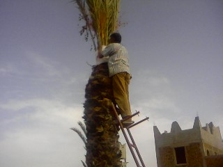 Ainsi qu'on le voit sur les trois photos ci-dessus, notre "palmériste" - néologisme de mon invention ;-) - a donc grimpé sur son échelle et a enlevé les palmes extérieures des trois dattiers.