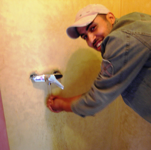 Tout dernièrement, l'espoir était réapparu : l'eau coulait enfin dans la douche de la suite Tiznit, qui m'avait déjà donné quelques soucis. Azzedine nous a fait la démonstration qu'un filet d'or bleu sortait bien du mélangeur. Problème numéro un : ce n'était vraiment qu'un petit filet ! Aucune pression ! Problème numéro deux : aucun joint n'avait été posé avec la grille installée sur le sol de la douche. Résultat : l'eau suintait à l'étage en dessous... Super pour se doucher dans le salon Cinq mondes qui abrite le bureau !