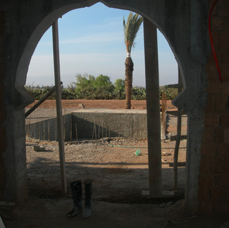 Voici sur la première photo l'entrée de la salle de bains de la suite Tiznit. Remarquez la petite encoche à gauche de la porte. C'est l'une des niches qui ont été précédemment creusées. Deuxième photo : la douche de cette salle de bains a reçu une forme extérieure arrondie. Dernière photo : la vue sur le nord et le jardin. On distingue à droite la grande niche qui recevra l'une des armoires murales.